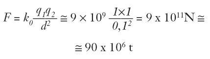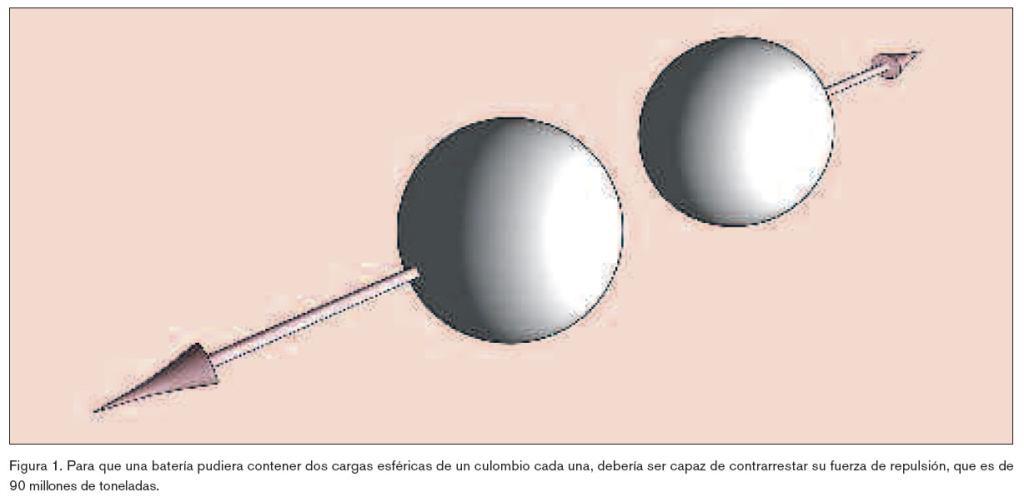 Se puede hacer una estimación de la fuerza de repulsión de las hipotéticas car-gas aglomeradas. Aunque sólo se almacenaran dos culombios de carga negativa o dos culombios de carga positiva, la fuerza de repulsión entre esas cargas sería enorme, cualquiera que fuera la forma de repartirlas dentro de la pequeña caja que es la batería. Si, para simplificar el cálculo, suponemos que se distribuyen los dos culombios en dos esferas dentro del recipiente, la fuerza de repulsión entre esas dos esferas es la misma que si la carga de cada una estuviera situada en su centro. Así, podemos aplicar la ley de Coulomb para hallar esa fuerza de repulsión. Si imaginamos los centros de las esferas separados, digamos, 10 cm, que es una distancia acorde con las dimensiones de una batería, y tomamos para la constante de Coulomb K0 ? 9 × 109 Nm2/ C2, la fuerza de repulsión vale