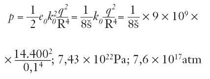 Más de 1017 veces la presión atmosférica, una presión inconcebible, que la haría explotar como una potente bomba. Realmente, antes de que esto ocurriera las cargas saldrían del conductor repelidas por esa fuerza.