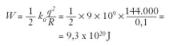Pero aún mejor que hallar la fuerza de repulsión entre las cargas sería estimar la energía electrostática que esa aglomeración de 144.000 culombios almacenaría. La energía electrostática es la energía que se debe a la fuerza entre las cargas, es decir, la energía de la expansión que se produciría si, al dejarlas sólo sometidas a sus propias fuerzas de repulsión, se les permitiera dispersarse. Puesto que se trata de una estimación, para que resulte sencillo el cálculo, supondremos de nuevo la carga de 144.000 culombios, que designaremos por q, distribuida uniformemente en la superficie de la esfera conductora anterior. Entonces la energía electrostática es1