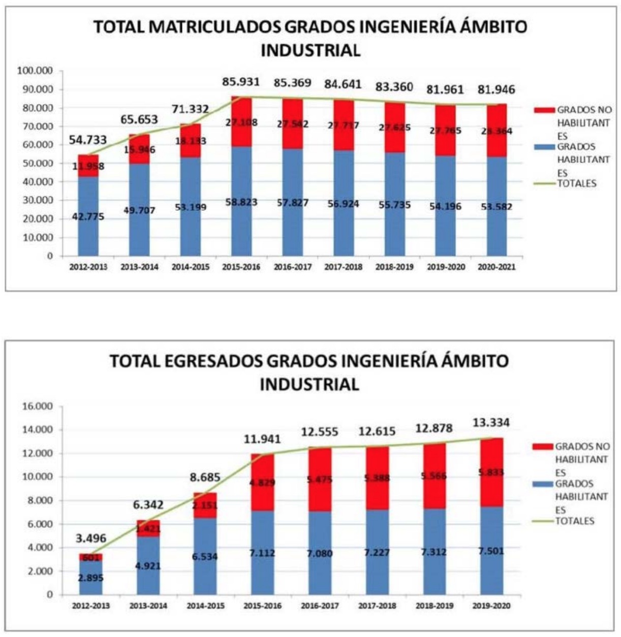 Por su parte, la cifra total de alumnos matriculados en grados habilitantes desde el curso 2012-2013 hasta el curso 2019-2020 fue de 482.768, mientras que la de matriculados en los grados no habilitantes se situó en 212.158 (algo menos de la mitad). En total, 694.926 alumnos se matricularon durante ese periodo en grados en Ingeniería del ámbito industrial, tanto en grados habilitantes como no habilitantes. El número de alumnos matriculados ha experimentado un considerable aumento desde 2012, si bien se aprecia un fuerte repunte en el curso 2015-2016, y un ligero descenso en los años posteriores.