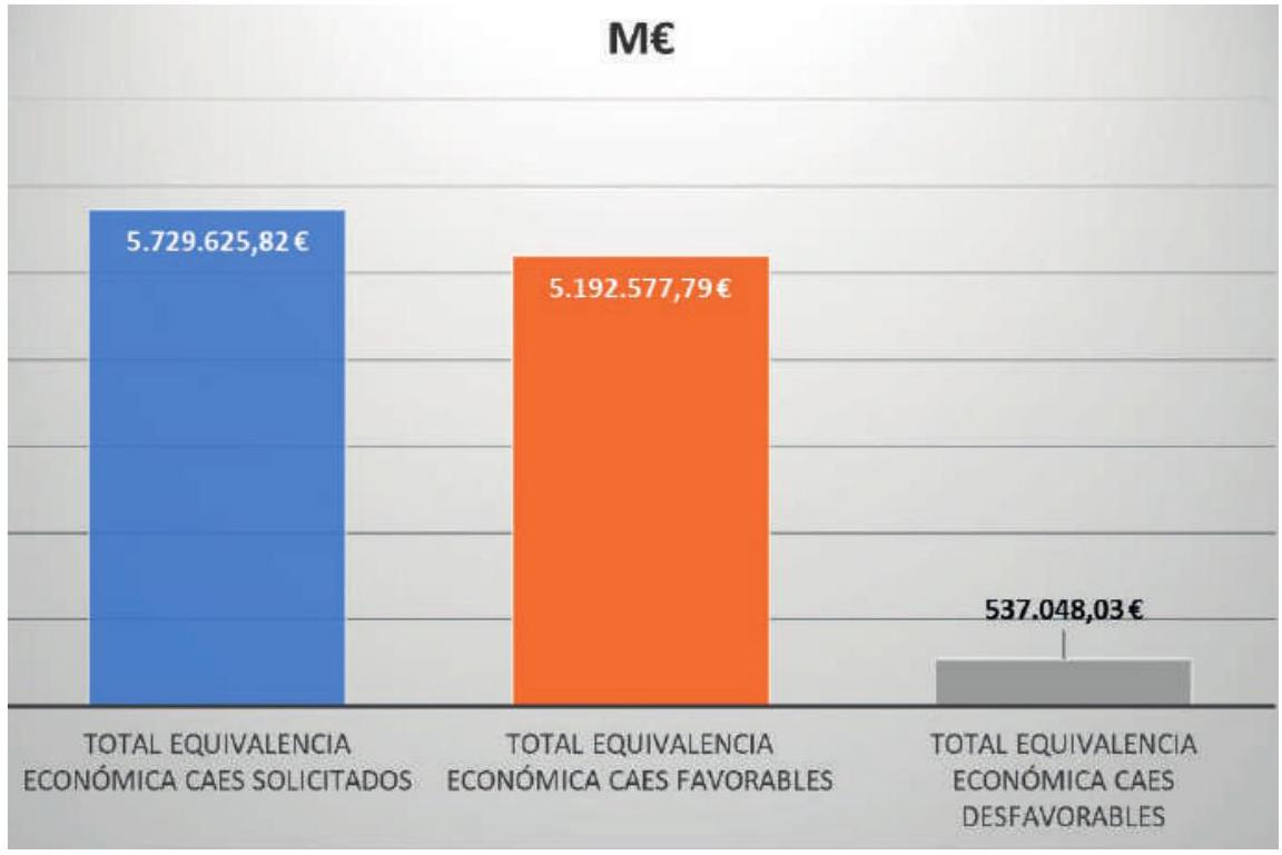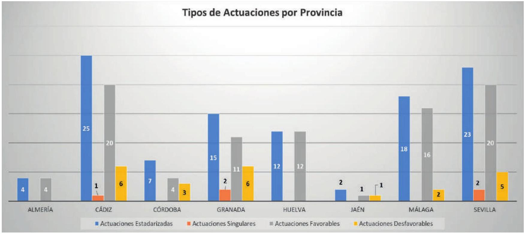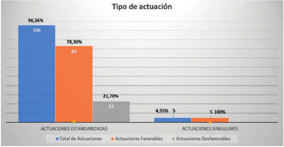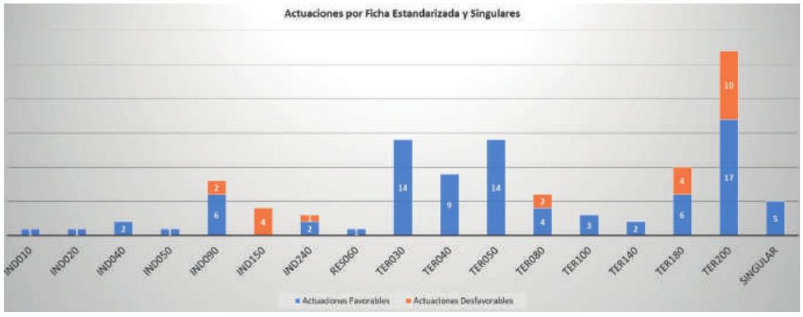 En esta gráfica (Fig. 10) se ve el total de actuaciones que han conformado las solicitudes recibidas, desglosadas por estandarizadas y singulares y las que han sido informadas favorable y desfavorablemente.