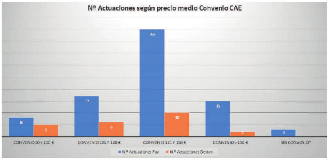 En lo referente al precio de venta de los ahorros entre el propietario inicial del mismo y el sujeto obligado o delegado, se añade la siguiente gráfica (Fig. 13), en la que se indica el n. total de actuaciones (favorables y desfavorables) por intervalos en el precio unitario del MW/h de ahorro.