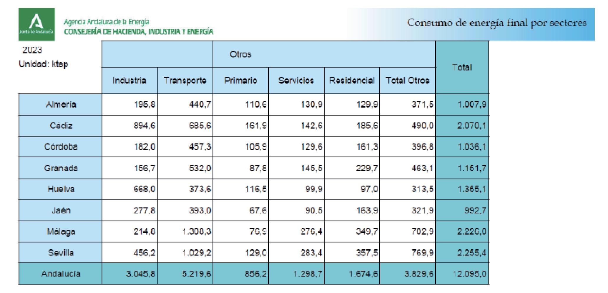 En el portal info-Energía de la Agencia Andaluza de la Energía, se pueden obtener los datos de consumo en energía final de Andalucía, en ktep (kilotoneladas equivalentes de petróleo), diferenciados por provincia y por sectores (actualizado a 31/10/2024) (Fig. 14).