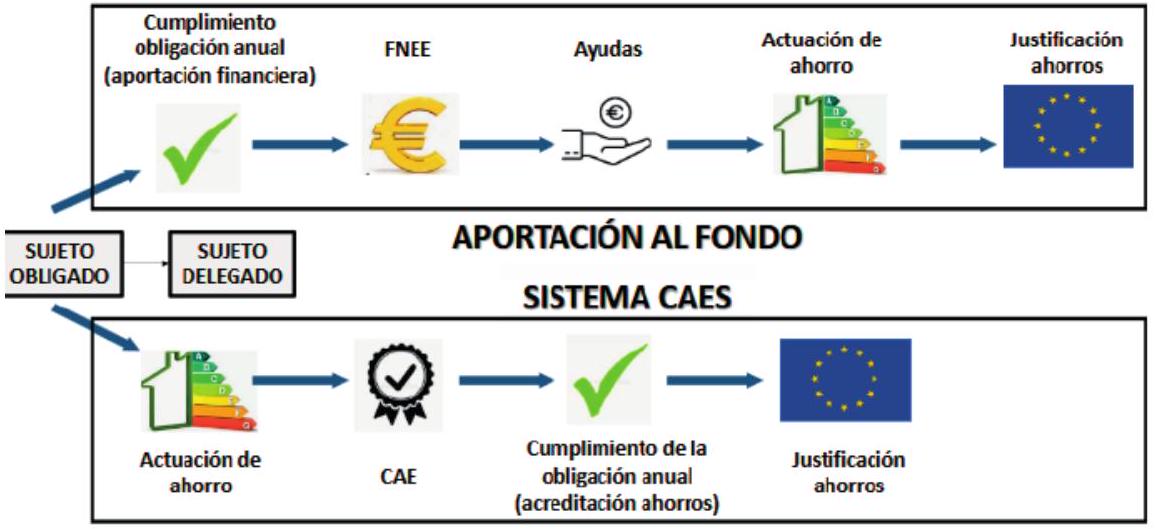 Dentro de la alternativa al sistema de obligaciones surge el sistema de certificado de ahorro energético (CAE) para que, a través de la realización de proyectos de eficiencia energética y el impulso de un mercado en este sector, se pueda alcanzar el cumplimiento con el objetivo marcado para España para el periodo 2021-2030 con mayor facilidad, además de intentar facilitar la inversión en tecnologías de eficiencia energética.