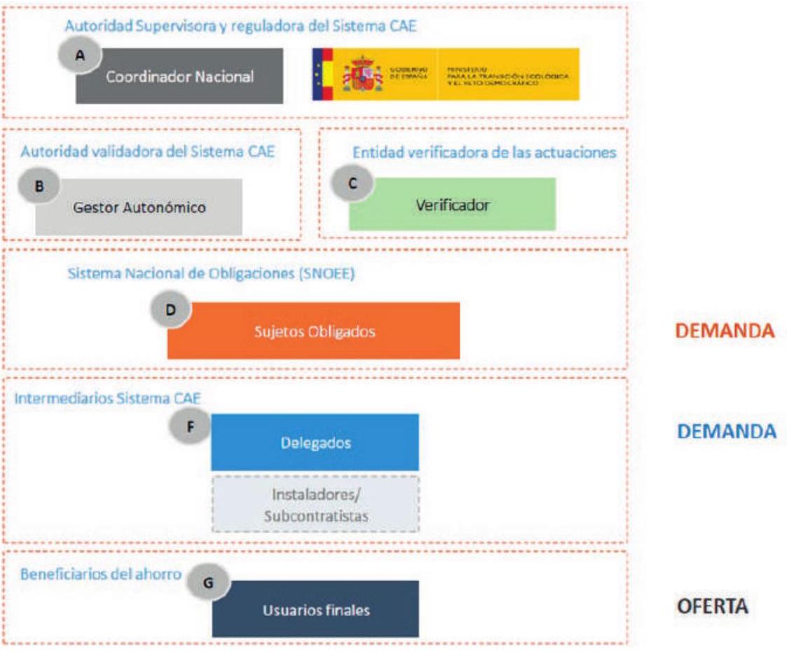 - Coordinador nacional del sistema de CAE: órgano administrativo encargado de asegurar el correcto funcionamiento del sistema de CAE en el ámbito nacional. La coordinación nacional del sistema de CAE corresponderá a la Dirección General de Planificación y Coordinación Energética del Ministerio para la Transición Ecológica y el Reto Demográfico.