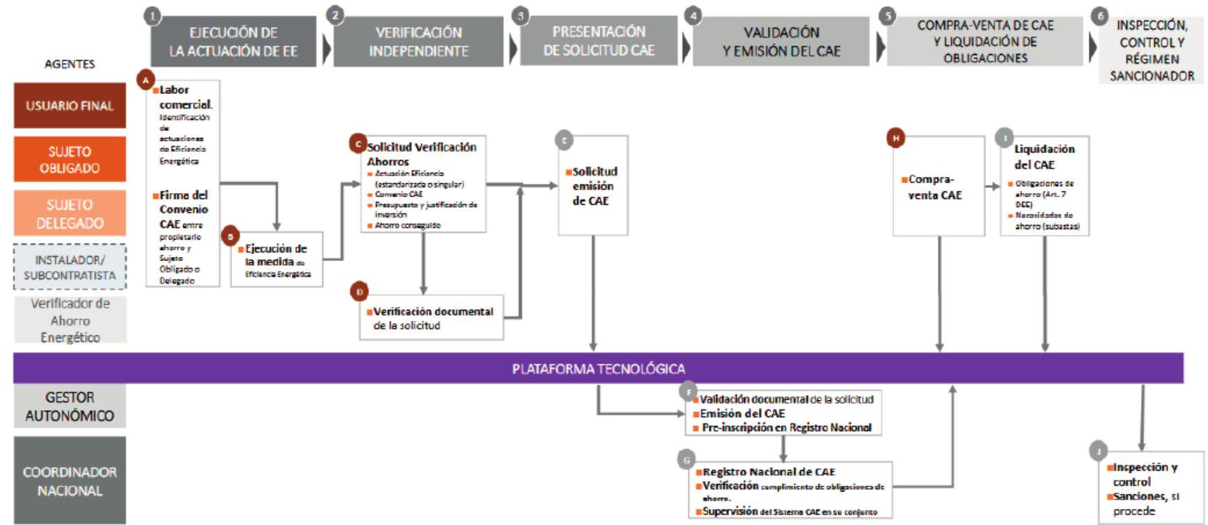 Una vez definidos los intervinientes, de manera básica, al inicio del proceso para la obtención de los CAE, hay que incluir finalmente a la Administración, actor/es final/es para la emisión de los certificados de ahorro energético (Figs. 3 y 4):