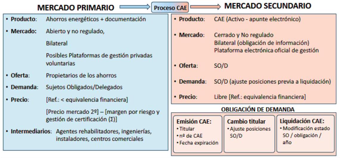 Mientras que ambos mercados la demanda se genera por parte de los sujetos obligados yo delegados, en el mercado primario la oferta parte de los propietarios de los ahorros, es decir, aquellos participantes del sistema que han realizado la inversión inicial en la actuación de eficacia energética y que han obtenido ahorros en el consumo de energía final.