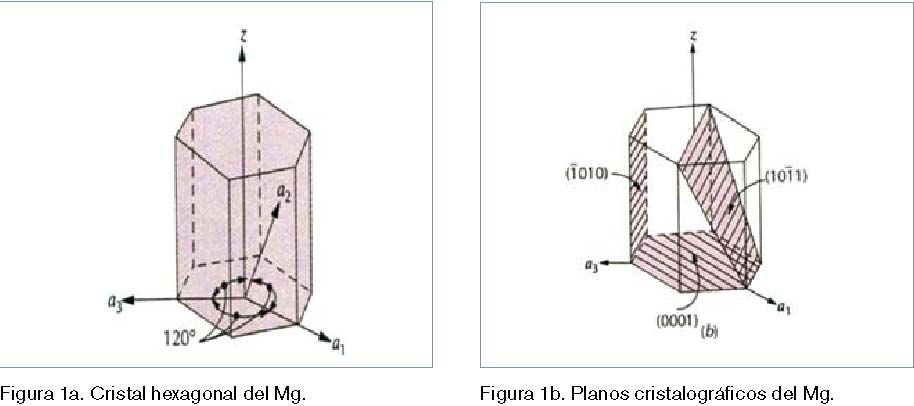Por otro lado, gran parte de la información sobre la estructura cristalina y las propiedades termodinámicas del magnesio puro son el resultado de la evaluación realizada por autores como Okamoto (1988). La estructura cristalina del magnesio puro a presión atmosférica es hexagonal compacta. El cristal elemental, sus ejes principales y algunos planos cristalográficos se muestran en la figuras 1a y 1b. Auto-res como Pérez-Albuerne et al. (1966) consideraban que podría existir una fase doble hexagonal compacta según sus datos de rayos X y a los datos de resistividad eléctrica de Stager y Drickamer (1963). Sin embargo, no hay confirmación de la existencia del magnesio II hasta la fecha. Las características importantes del magnesio, así como