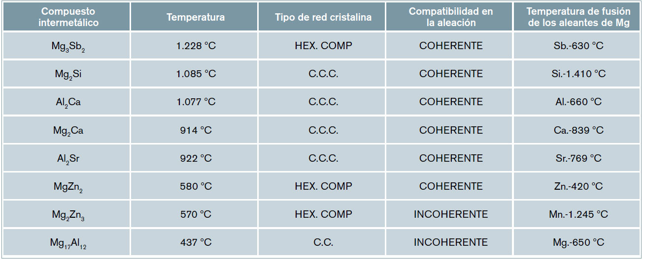• Se ha comprobado que la presencia de otros compuestos intermetálicos con mayor punto de fusión como el Mg2Si (1.085 ºC), el Mg3Sb2 (1.228 ºC), el Al2Ca (1.077 ºC) el Mg2Ca (914 ºC) dan mayor estabilidad a las aleaciones de magnesio y mejoran la capacidad mecánica a bajas temperaturas, ya que se dispersan mejor en la matriz de S.S. ? de aluminio en magnesio y también mejoran considerablemente la resistencia a creep.