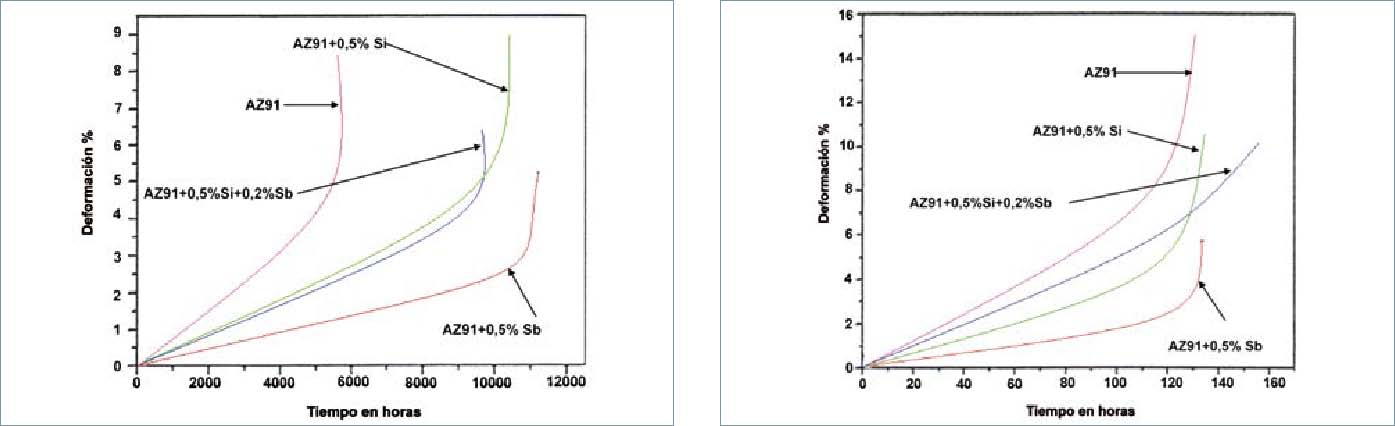 Si a la aleación AZ91 se le añade 0,5% de antimonio (Sb) y 0,5% de silicio (Si), se forman los compuestos Mg3Sb y Mg2Si. Los ensayos de creepa 150 ºC muestran una clara mejoría, con relación a la propia aleación AZ91, según Srinivasan et al (2013). Esta mejoría, sin embargo, no persiste por encima de 200 ºC (Figs. 2a y 2b).