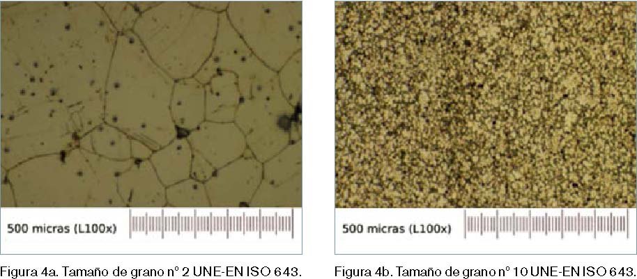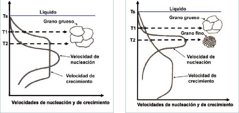 Es importante destacar la influencia que la velocidad de enfriamiento ejerce sobre el tamaño del grano. Esta velocidad va a depender del proceso de moldeo. En las figuras 4a y 4b se observan dos probetas obtenidas mediante moldeo en arena (enfriamiento lento) y mediante moldeo en coquilla metálica (enfriamiento rápido).