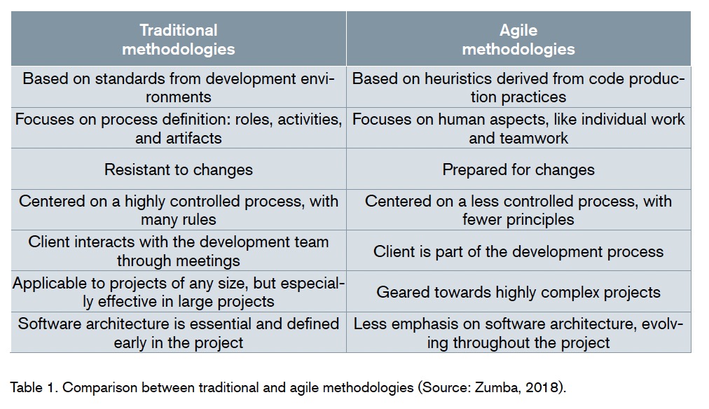 Regarding the evolution of methodologies, while traditional methodologies like the waterfall model, V-model, or incremental development were previously preferred, agile methodologies are now more common. In table 1, a comparison between traditional methodologies and agile methodologies can be found:
