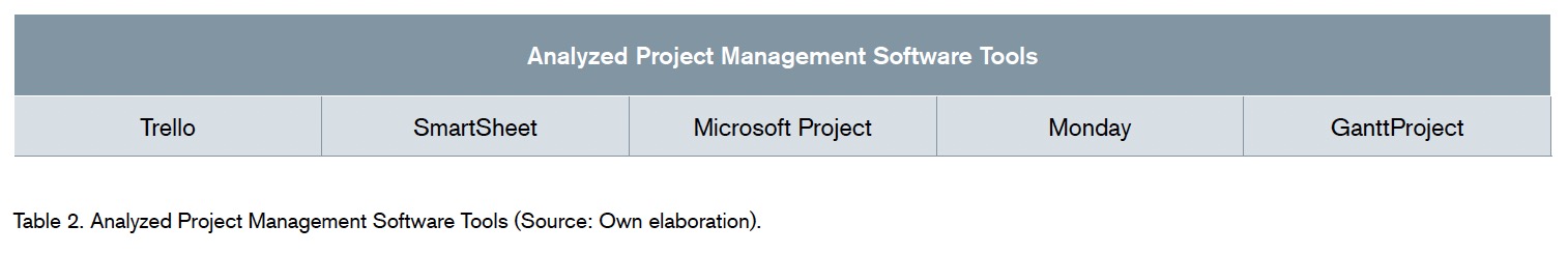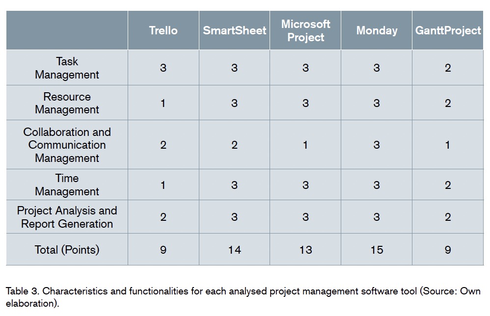 Thus, the features of five project management software tools were analyzed, as not all offer the same functionalities. The analyzed software tools are shown in table 2: The characteristics are evaluated with 1, 2, or 3 points, based on the following: