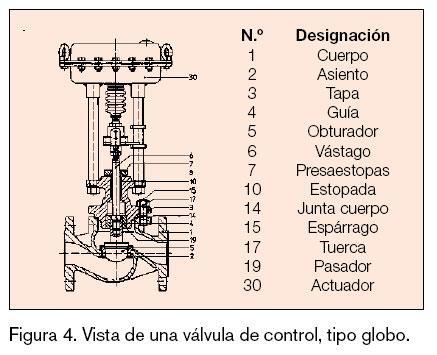 El elemento final de control por excelencia es la válvula automática (ver figura 4), aunque sin olvidar otros, por ejemplo los variadores de velocidad en sus diversas formas. Dentro del lazo cerrado de control, el elemento final es un componente tan importante como los otros dos elementos del lazo, de ahí la importancia de su correcta elección en la fase de diseño en cuanto a dimensionado, tipo y características inherentes. La válvula de control básicamente se compone de: cuerpo y actuador. El cuerpo está en contacto con el fluido que manipula, y el actuador ejerce la fuerza de posicionamiento del obturador; su forma más común es la neumática.