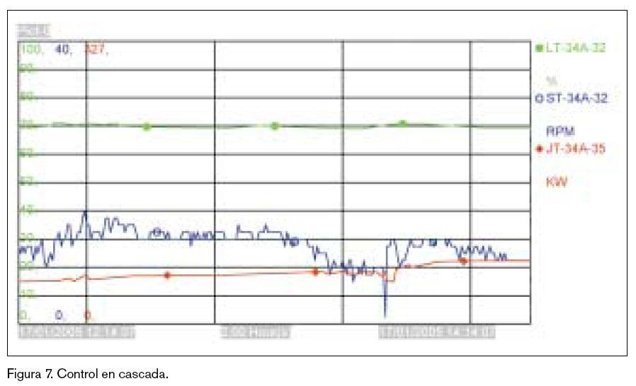 Además, independientemente de la mejora que puede suponer para la variable controlada la estrategia de control en cascada, pueden existir otras variables del proceso que se vean beneficiadas, lo cual da valor para la estabilidad y rendimiento de la planta. Como ejemplo práctico, en la figura 6, con una base de tiempo de dos horas, se representan las tendencias de las variables de un control de nivel, en configuración de lazo simple, donde el trazo verde es la variable controlada, o sea la evolución del nivel del tanque ante un SP del 60 %, el trazo azul representa las revoluciones de la bomba extractora del producto del tanque (variable manipulada) y el trazo rojo la potencia absorbida por el motor que acciona la bomba, el cual es de 6 kV y de una potencia de 220 kW.