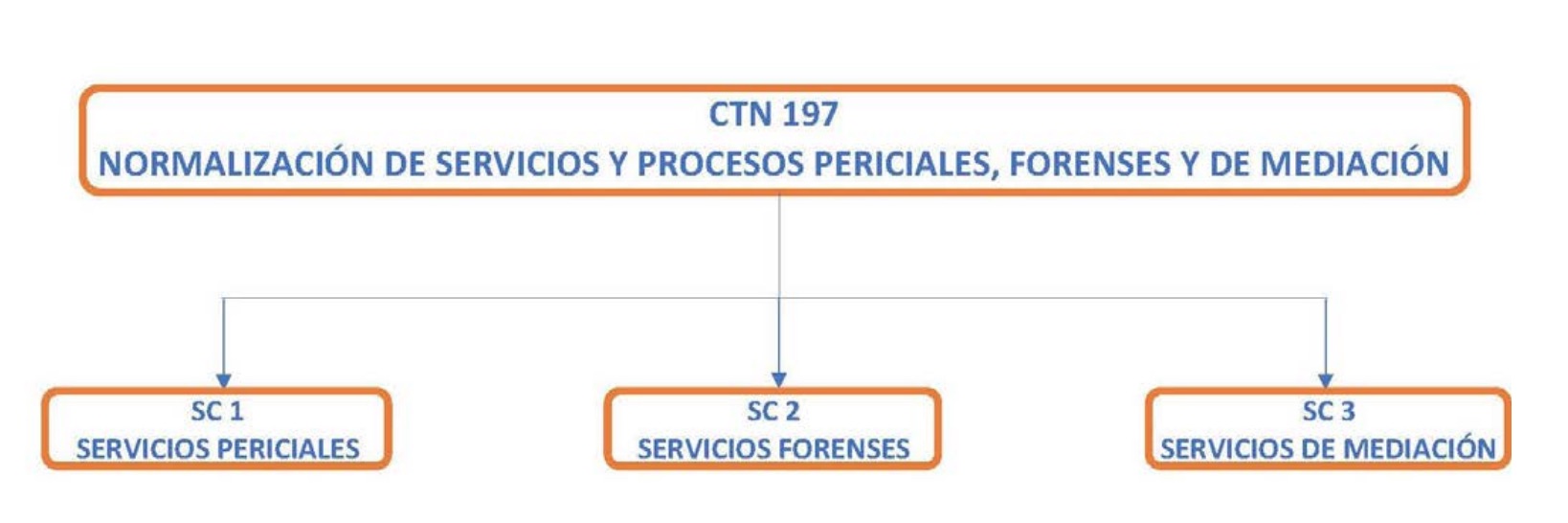 Para representar a UNE en la elaboración de la Norma ISO 21043 se creó el GT3, Procesos de ciencias forenses, compuesto por las fuerzas y cuerpos de seguridad, tanto del Estado como autonómicos, así como laboratorios oficiales. Finalmente ha crecido el interés en la elaboración de una norma de servicios de mediación. Por ello, se procedió, en la reunión del 28 de enero de 2020, a modificar el campo de la actividad y la reorganización de la estructura del CTN197 en subcomités para racionalizar las distintas competencias, que fue aprobada por la dirección de UNE en su reunión de la primera quincena de marzo de 2020, según se relaciona a continuación: