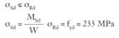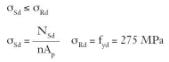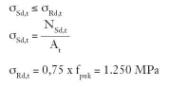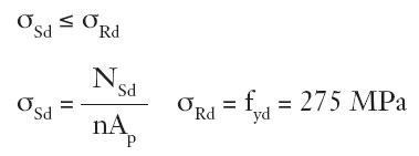 en que NSd representa el valor de cálculo del esfuerzo de tracción máximo en el apoyo , n = 2, o el número de tornillos en ese apoyo, A el área útil de la sección transversal del tornillo, sSd el valor de cálculo de la tensión de la tracción actuante y sRd el valor de cálculo de la resistencia a tracción del acero del tornillo
