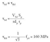 Siendo V el valor del cálculo del esfuerzo de corte máximo en el apoyo, n = 2 indica el número de tornillos por aparejo de apoyos, indica el valor de cálculo de la resistencia al corte del acero del tornillo, Sp el momento estático de la sección superior del eje de referencia, Ip su momento de inercia y tp la longitud de la sección siguiente al eje de referencia.