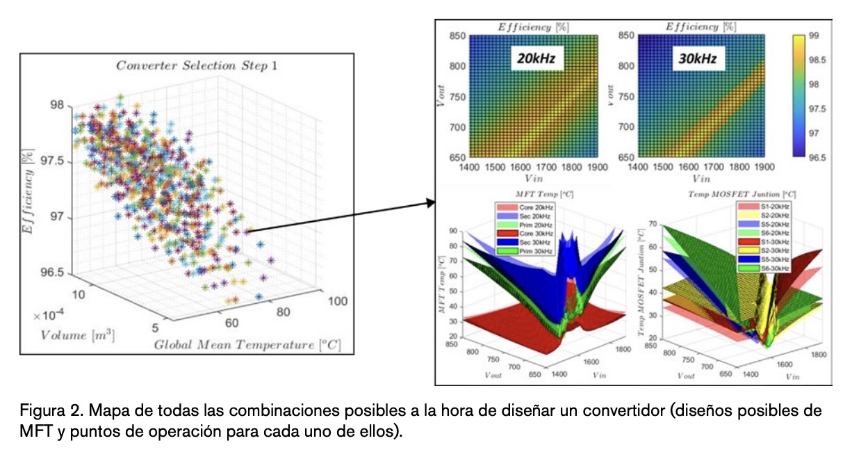 El proyecto desarrollado se encuentra dentro de mi tesis doctoral, que abarca todos los aspectos del diseño del convertidor de potencia. No se limita únicamente al transformador de media frecuencia, sino que también incluye el diseño y la gestión térmica de los semiconductores, la selección de condensadores de filtrado, el diseño de las conexiones entre componentes para minimizar las inductancias parásitas, el control, y la optimización de los diferentes modos de operación. La complejidad del diseño y la cantidad de variables del mismo, al final, llevó a realizar una optimización por fuerza bruta; esta optimización requería estudiar 1,6 millones de posibles combinaciones, lo cual hace inviable el uso de cualquier modelo relativamente lento. Las simulaciones de elementos finitos empleadas para validar térmicamente el diseño requieren 5 minutos por cada una de ellas, lo que implicaría 15 años para generar el diseño final usando esta técnica.