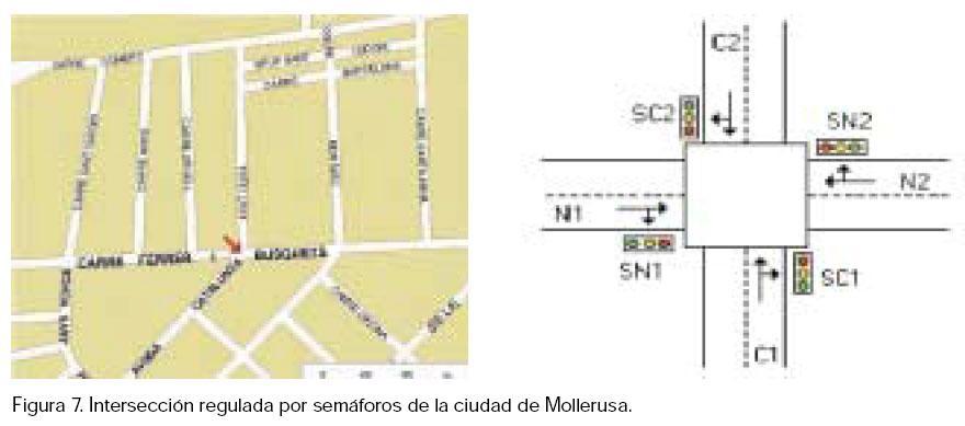 El trabajo consiste en estudiar el flujo de circulación de vehículos en una intersección regulada por semáforos. A partir de diversas mediciones, los estudiantes establecieron la duración óptima de cada color del semáforo en función de la densidad de vehículos. Se estudió un caso real ubicado en la ciudad de Mollerussa (provincia de Lleida). Se establecieron analogías entre los elementos clásicos de la teoría de circuitos y las características del tráfico rodado. En el proyecto estaban involucrados elementos de teoría de grafos, leyes de Kirchoff, etc. En el mismo se confeccionó una presentación en flash.