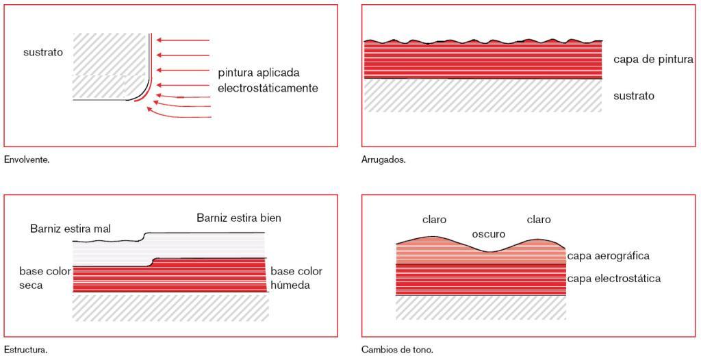 Algunos defectos son propios de algunos tipos de pinturas o de capas internas (pintado por cataforesis, imprimación…). Por ello nos centraremos en una aplicación bicapa de base color pastel o metalizada y el barniz correspondiente.