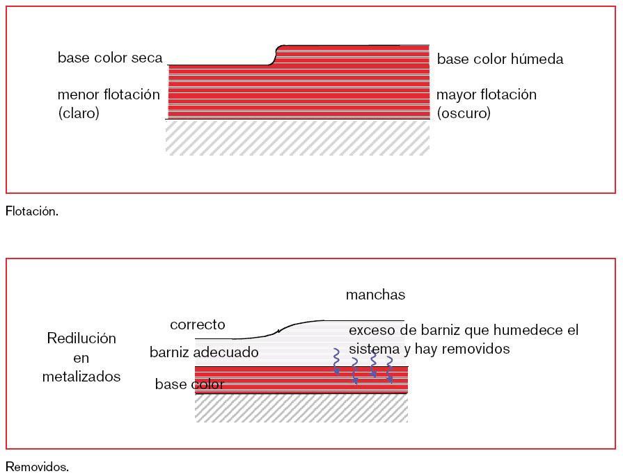 – Flotación: distribución no homogénea de pigmentos debida a las diferencias de densidad, que dan una tonalidad diferente a la del color patrón. Es un defecto típico de colores metalizados. Puede ser por exceso de capa, uso de disolventes demasiado lentos, catalizador inadecuado, mala pulverización (gota grande).