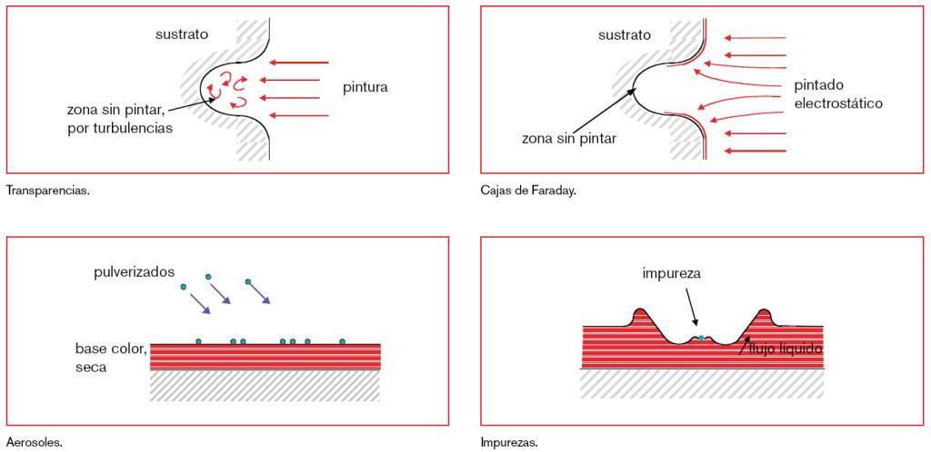 – Impurezas: suciedades en general que se depositan sobre la capa de pintura aún fresca, y se adhieren a ella. Este es un término muy general, que frecuentemente engloba a picos, moteado, aglomerados, etc.