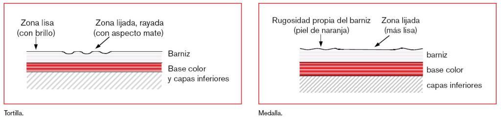 – Medalla: zona lijada con un abrasivo muy fino que elimina la rugosidad propia de la pintura, dando un aspecto más liso y brillante que al resto de la superficie.