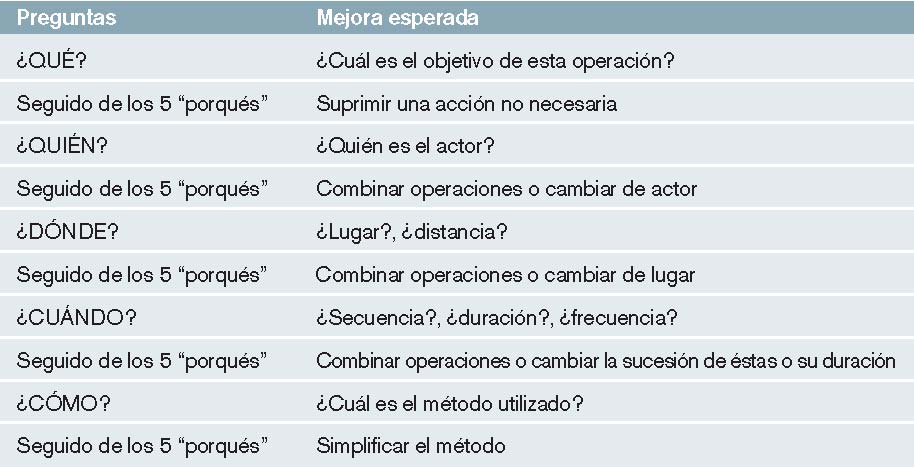El equipo utilizará el método QQDCC (véase la tabla 2), lo que significa que para cada operación formularemos las preguntas de qué, quién, dónde, cuándo y cómo, seguidas cada una de ellas de 5 “porqués”. De esta manera, se sistematiza la búsqueda de justificaciones para la posible eliminación o sustitución de tareas.