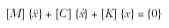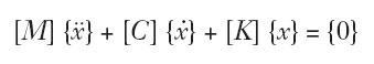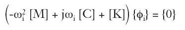 Donde [M] es la matriz de masa, [C] es la matriz de amortiguamiento, [K] es la matriz de rigidez, {x} es el vector de desplazamientos nodales, ?iy {fi} son la frecuencia circular y forma modal del modo i-esimo y j es la unidad imaginaria (v-1).