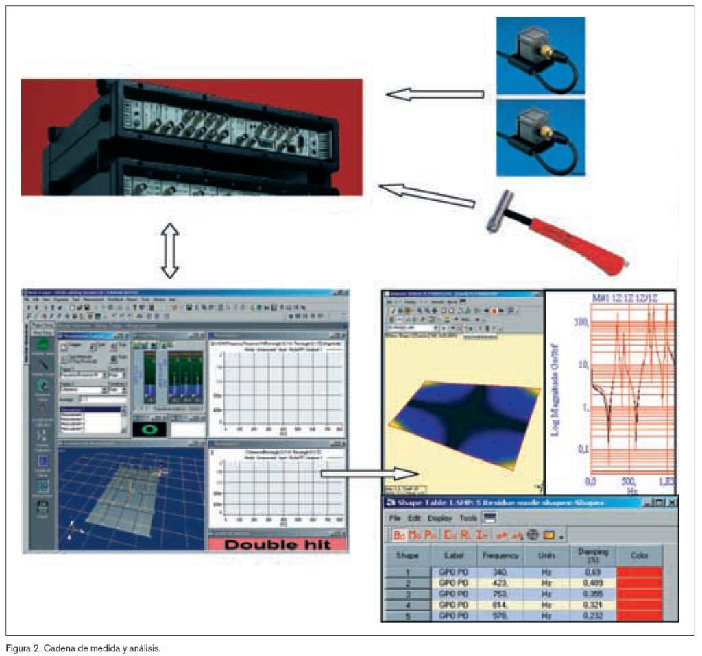 El equipo de medida y análisis consta de un analizador Pulse de siete canales, modelo 3.560 de Brüel & Kjaer, junto a un martillo de impactos y dos acelerómetros triaxiales de baja masa, completándose con el software MTC Hammer, específico para la definición y adquisición de datos para análisis modal experimental, y el software ME´Scope para el tratamiento de los datos, extracción de parámetros modales y formas modales.