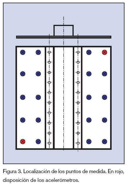 De los diversos ensayos modales realizados, y con el fin de analizar el número y colocación de los puntos de impacto más adecuados, y de la disposición de los puntos de referencia, se ha establecido en 20 el número de puntos de impacto a lo largo de la chapa, y de dos los puntos de referencia donde colocar los acelerómetros.
