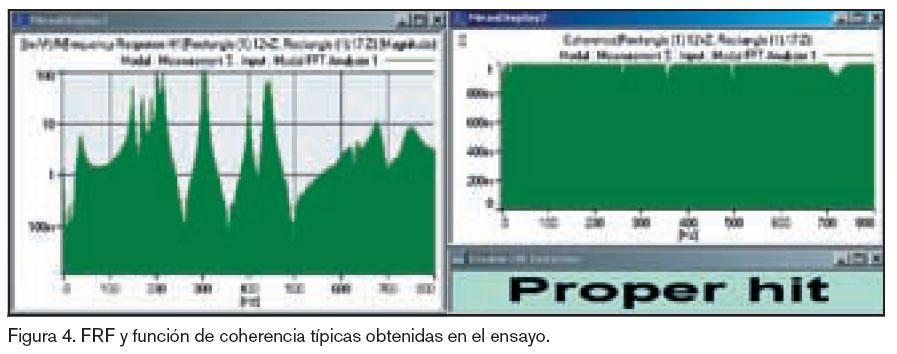 Asimismo, el rango frecuencial se fijó de 0 a 800 Hz con una resolución de 1.600 líneas, empleando un ventaneo rectangular. Con el fin de asegurar una buena medida y que ésta fuera repetible, se realizaban tres impactos sobre cada punto de medida, promediando linealmente las mismas, en la figura 4 se indica en la parte superior la FRF, y en la parte inferior, la función de coherencia típicas obtenidas en el ensayo.