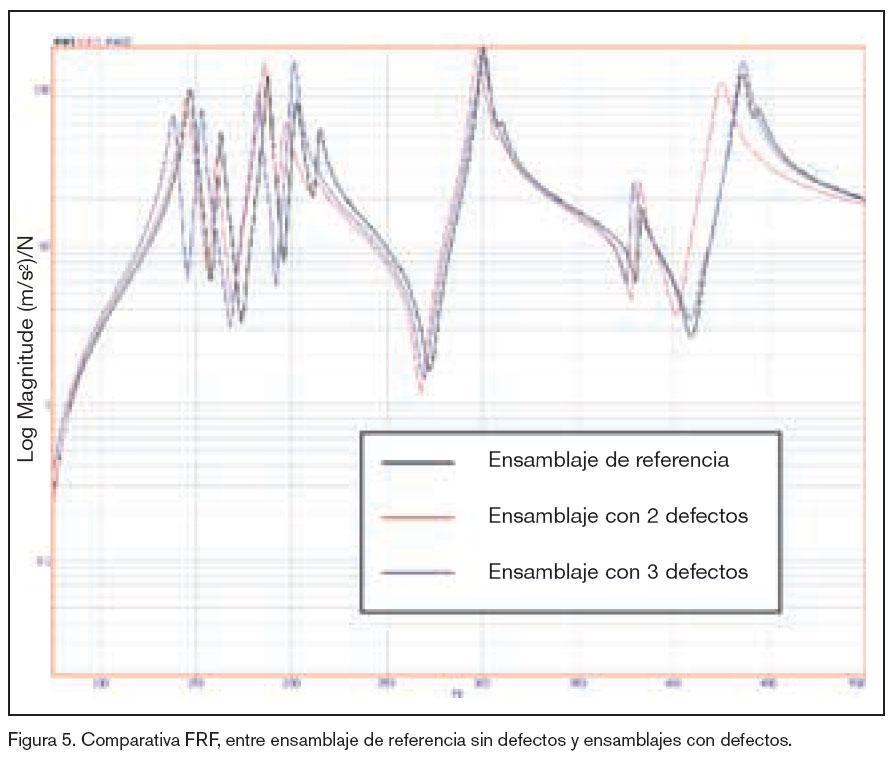 Así, en la figura 5 se muestran superpuestas la FRF obtenida para el ensamblaje sin defectos, y las obtenidas para ensamblajes con dos y tres defectos. En estas gráficas, cada pico indica un posible modo de vibración y se observa cómo se produce una disminución de las frecuencias naturales de los modos, conforme aumenta la severidad del defecto.