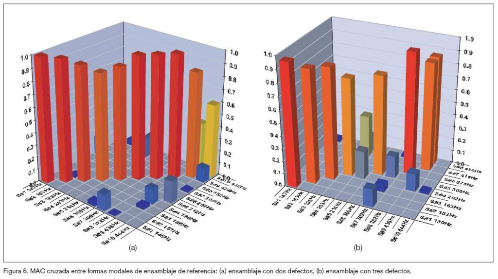 Otra forma de poder detectar la existencia de un defecto, es comparando las formas en que, para cada frecuencia natural, vibra la estructura. La semejanza entre dos formas modales se valora mediante el índice MAC (Modal Assurance Criterion); este índice presenta valores que van desde cero, si dos formas modales son totalmente distintas, hasta un valor de uno, si dos formas modales son iguales. En la figura 6 se muestran los valores de MAC, al comparar las formas modales del ensamblaje sin defectos y ensamblajes con dos y tres defectos. Se observan cómo disminuyen de manera significativa estos valores para ciertos modos, llegando incluso a valer cero en el ensamblaje con mayor número de defectos.