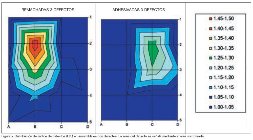 Así, mientras que las variaciones en este parámetro se encuentran en torno al 10 % entre ensamblajes sin defectos, la variación que se produce en el caso de ensamblajes con dos defectos se sitúa en valores del 20 %-30 %, llegando en algunos casos a valores del 50 % en ensamblajes con tres defectos. La detección de un solo defecto sólo resulta fiable en el caso de que el análisis se realice sobre el mismo ensamblaje, y se comparen los resultados antes y después de la aparición del defecto, ya que las variaciones observadas para el caso de la existencia de un defecto son del orden del 5 %-10 %.