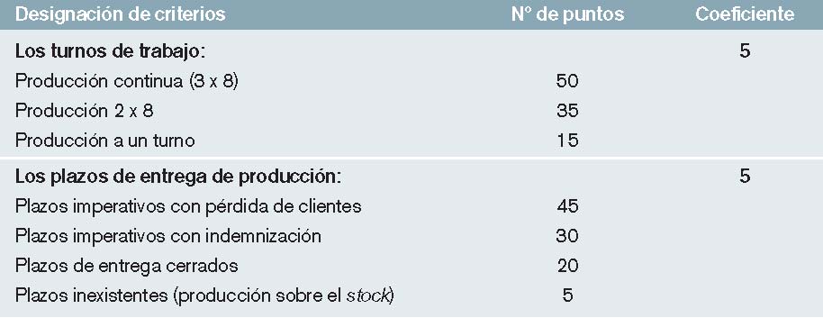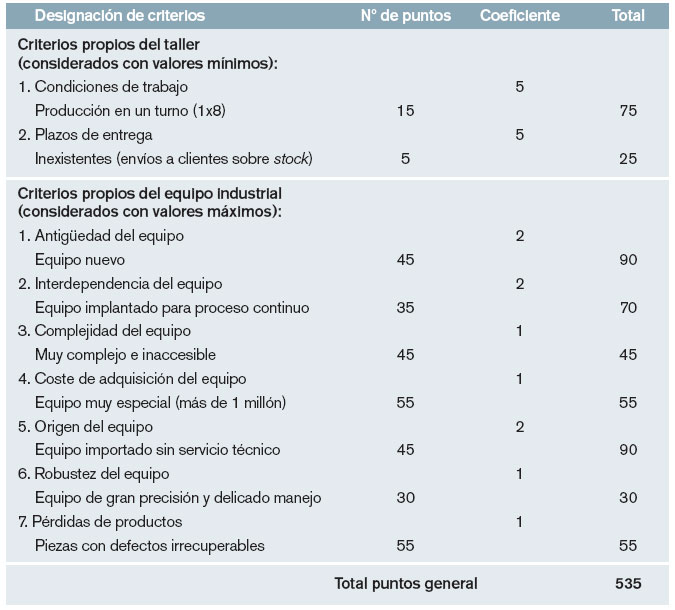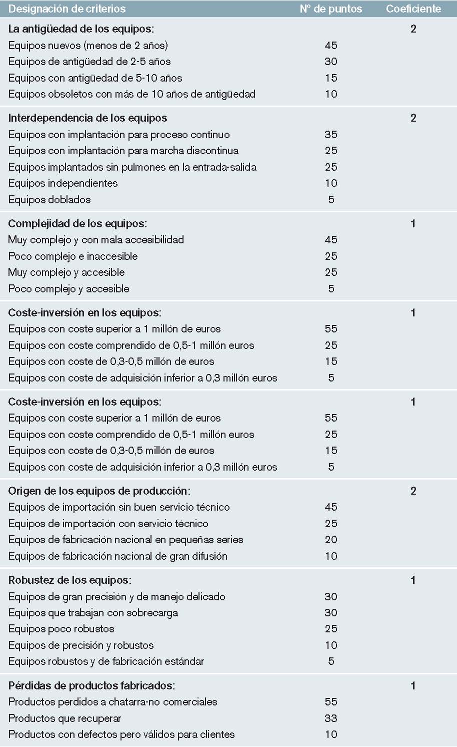 b) Determinación de coeficientes (tabla 8): se dispone de 10 puntos de coe-ficientes para las características propias de cada máquina. Se reparten 5 puntos para la importancia de la máquina en la producción y 5 puntos para la tasa de utilización.