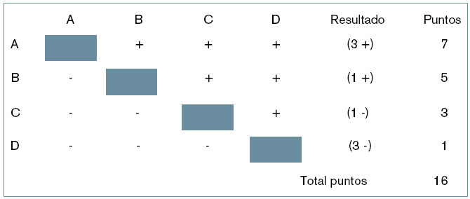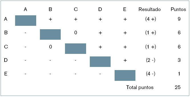 Para este criterio la repartición de puntos puede partir del método de comparación por pares que permite una jerarquización fácil, pues cada apartado es comparado sucesivamente con los demás. Esta comparación la podemos efectuar con ayuda de una tabla de doble entrada (tabla 2), de forma que cada vez que se considere el M/Preventivo justificado se pone el signo +, y, de lo contrario, el signo – . Si no hay preferencia, se pone 0.