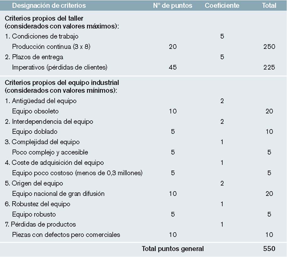 Cada apartado va a tener un cierto número de puntos que han sido atribuidos com-parándose entre ellos, tanto desde el punto de vista económico como técnico, pero también y sobre todo gracias a la expe-riencia de los responsables y utilizadores del equipo industrial.