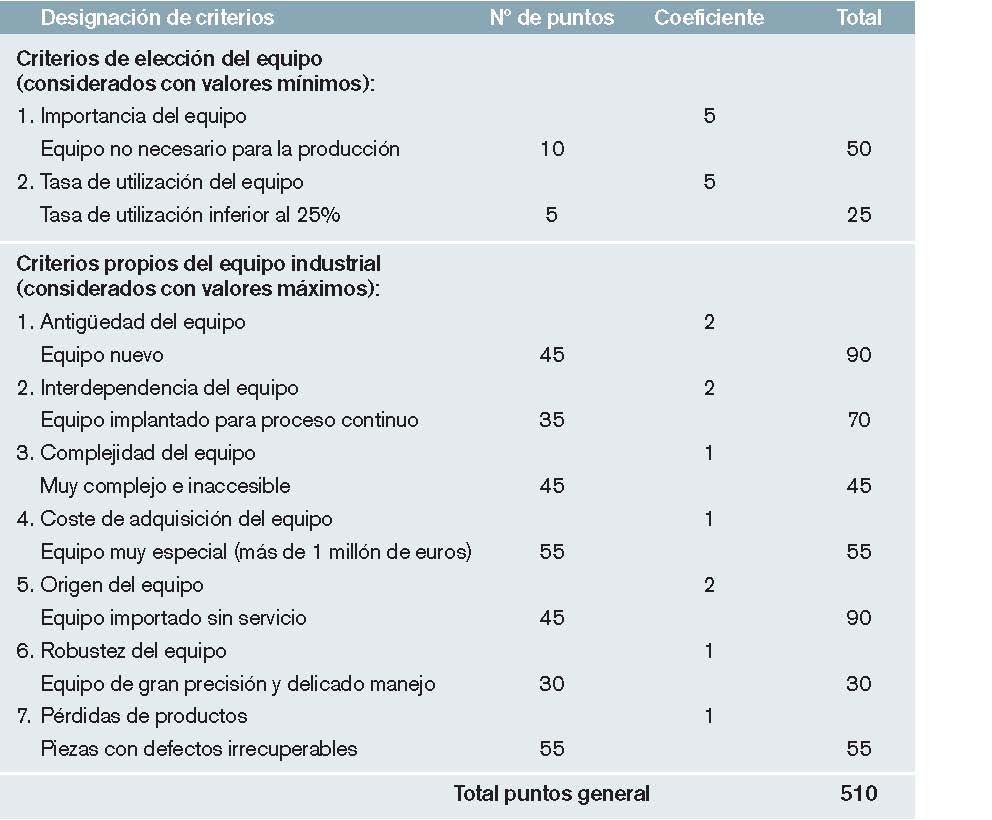 En la tabla 10 se identifican los pun-tos límite por encima de los cuales el equipo-máquina necesita de un plan de M/Preventivo. Se toman los criterios de elección del equipo en sus valores máxi-mos y los propios del equipo-máquina considerado en sus valores mínimos.