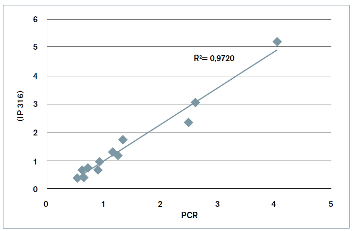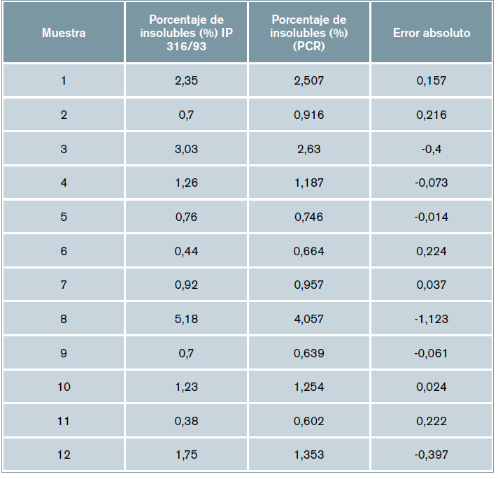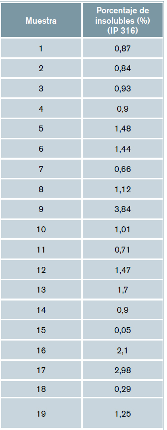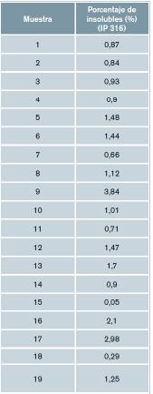IP 316 Los insolubles se miden de forma habitual mediante métodos basados en la sucesiva solubilidad o insolubilidad en distintos disolventes de los productos de alteración del aceite. Según el método indicado en la normativa IP 316, la parte insoluble en heptano se separa por centrifugación. El peso de precipitado seco representa el contenido de insolubles. El método normalizado mediante la norma IP 316 presenta algunos problemas (figura 3); el objeto de este trabajo es proponer una serie de mejoras a través de un método alternativo basado en la quimiometría (Diaby, 2009).