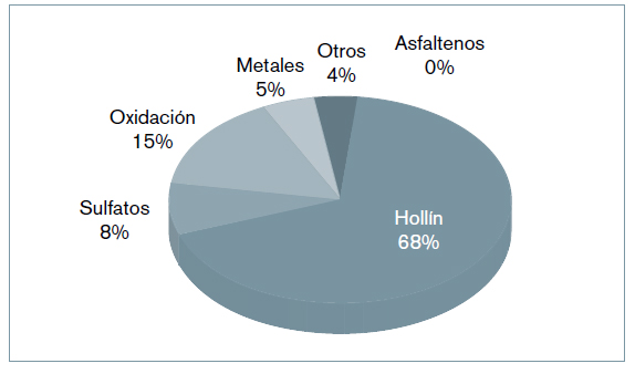 La composición de los insolubles depende del tipo de motores al que nos refiramos. A continuación se muestran gráficamente en las figuras 1 y 2 las distintas distribuciones en función del combustible usado en el sistema de propulsión según los estudios que se han realizado en este trabajo.