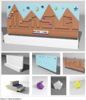 El producto panel montañero (figura 5) está formado por tres grandes partes unidas mediante encaje. La primera, sobre la que reposa el resto se trata de una caja base de color blanco. Está provista de un espacio entre la parte posterior y la parte delantera por el que caerán las piezas que se introducirán en la parte superior del panel.