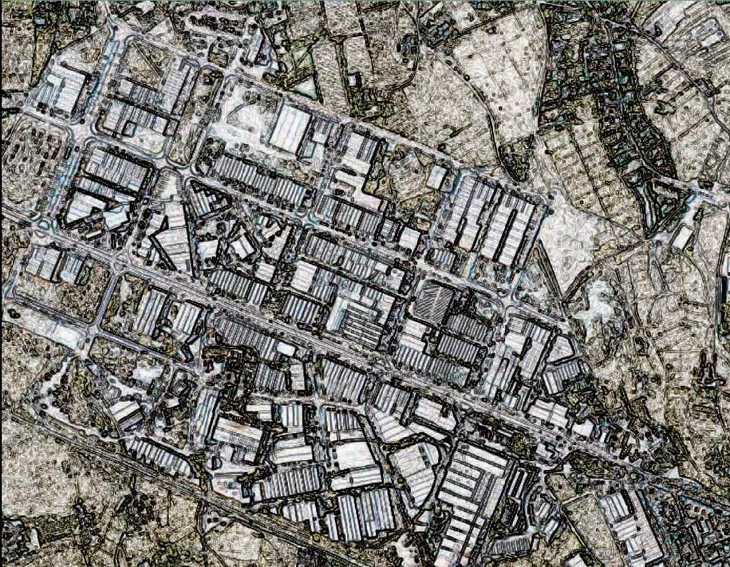 Figura 1. Imagen aérea del polígono industrial superpuesta a la base cartográfica para corrección de errores y validación de cartografía.