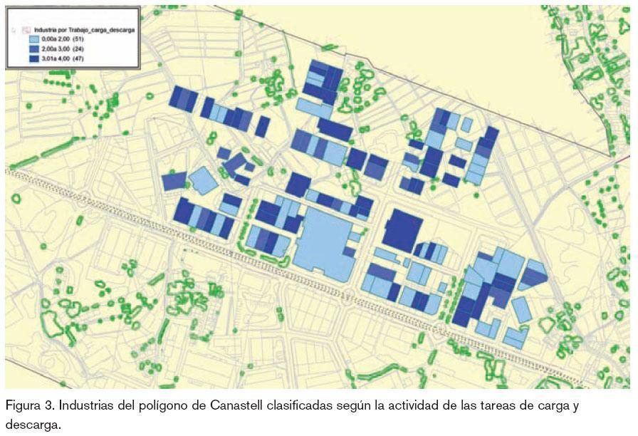 Se realiza una primera consulta, en la que se muestra una clasificación de todas las industrias o actividades empresariales en función de la mayor o menor actividad (horas al día) de tareas de carga y descarga, del tiempo en horas que se realizan estas tareas al cabo del día. Se asigna el valor de 1 si se realizan tareas de carga y descarga una vez a la semana produciendo molestias en la vía de acceso por un tiempo inferior a 1 h; se le asignará el valor de 2 cuando se realizan tareas de carga y descarga al menos dos veces a la semana produciendo molestias en la vía de acceso por un tiempo inferior a 2 h; se le dará el valor de 3 cuando se realizan tareas de carga y descarga una vez al día produciendo molestias en la vía de acceso por un tiempo inferior a 2 h; se le dará el valor de 4 cuando se realizan tareas de carga y descarga durante todo el día produciendo molestias en la vía de forma continua (figura 3). En esta consulta se obtienen aquellas actividades que presentan mayor o menor tránsito de mercancías, interesándonos por las actividades de mayor conflicto.