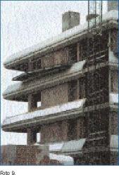 En las fotos 6 y 7 se puede apreciar un edificio con un diseño ciertamente particular, constituido por dos sistemas estructurales diferenciados; una parte central porticada de forma cuadrada en planta y un núcleo exterior destinado a la ubicación de ascensores y escaleras. En el mismo, se ha conseguido un considerable aumento de los metros cuadrados de superficie útil mediante (1.º) el ensanchamiento lateral a partir de la primera planta de la estructura porticada (foto 8) y (2.º) a través de los cuatro voladizos situados en las esquinas de la última planta, como se puede apreciar en las fotografías.