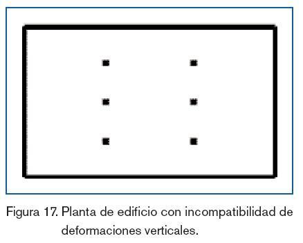 La figura 17 representa la planta de un tipología de construcciones empleadas para garajes de vehículos, formadas por dos sistemas estructurales bien diferenciados; uno constituido por pantallas de rigidización perimetrales y el otro por pórticos interiores. Ambos sistemas están conectados entre sí a través del piso de cada planta. Construcciones de este estilo colapsaron durante el terremoto de Northridge de 1994. El motivo de dicho colapso, fue que no se consideró la interacción –al menos totalmente– de los dos sistemas estructurales; a pesar de que los diafragmas rígidos formados por la losa de piso de cada planta, aseguran que las deformaciones debidas a desplazamientos horizontales sean compatibles, no ocurre lo mismo con las verticales. La componente sísmica vertical del terremoto de Northridge poseía un valor notable, lo que dio lugar a un comportamiento sísmico inadecuado en esta tipología de construcciones, al provocar en las vigas centrales de la planta, una falta de apoyo vertical.