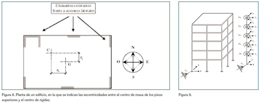 La disposición en planta debe ser lo más simétrica que sea posible, tanto en lo que respecta al conjunto, como al esqueleto resistente vertical (incluidos todo tipo de arriostramientos) y a elementos no intencionadamente estructurales (como muros de cerramiento, tabiques, etc.). Lo ideal sería buscar una disposición en planta con dos ejes de simetría ortogonales (figura 2). Disposiciones en planta con un único eje de simetría (figura 4) o con ninguno (figura 5) separan el centro de masas del de rigidez (también llamado centro de torsión o de cortante) no siendo aptas para cálculos por los métodos simplificados descritos por diversas normativas y dando lugar a esfuerzos internos de difícil evaluación, como consecuencia de la aparición de acciones de flexión acopladas con otras de torsión. Es decir, en cualquier nivel de un edificio, la fuerza de inercia inducida en un sismo actúa a través del centro de masas de los niveles superiores, mientras que la resultante de las fuerzas resistentes actúa en el centro de rigidez de los elementos resistentes del nivel en consideración. Si la estructura no tiene simetría dinámica, el centro de rigidez en un piso dado y el centro de masas por encima de ese piso no coinciden. En estas circunstancias se desarrolla un momento de torsión en el piso. Este momento de torsión en un piso es igual al producto del esfuerzo cortante del piso multiplicado por la excentricidad, que es la distancia entre el centro de masas superior y el centro de rigidez del piso. Esta distancia se mide en la dirección normal a la dirección de la acción del sismo. La figura 6 muestra las excentricidades ex y ey entre el centro de masas G y el centro de rigidez C para el sismo actuando en al dirección Norte-Sur y en la dirección Este-Oeste, respectivamente.