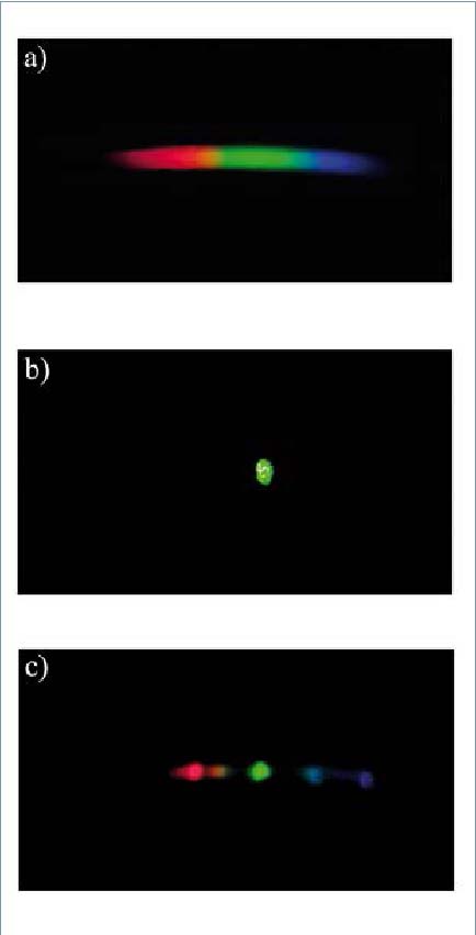 donde d es la distancia entre las rendijas de la red, λ es la longitud de onda incidente y n es el orden de difracción, que puede tomar cualquier valor entero, aunque nuestro sistema capturará solamente el primer orden de difracción (n = 1). En esta relación observamos la dependencia directa del ángulo difractado con la longitud de onda, con lo que, bajo iluminación policromática, la red de difracción produce una separación angular de las diferentes longitudes de onda que se puede focalizar sobre el sensor de la cámara.
