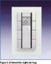 La calefacción y el aire acondicionado son los primeros consumidores de energía en una vivienda, a la vez que unos de los principales responsables del confort. En este caso, el sistema KNX/EIB dispone de controladores muy avanzados, tales como el termostato digital de Jung (figura 8), mediante los cuales se puede llevar a cabo un control de climatización tan avanzado como el que proporcionan la mayoría de los sistemas propietarios de climatización que hay en el mercado. Con la ventaja de que en este caso, la climatización queda integrada con el resto de las instalaciones de la vivienda. Entre otras, se pueden realizar las siguientes funciones: